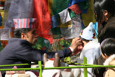 which is a place for both Buddhists and Hindus. It was colorful in the morning sun, decorated with thousands of prayer flags. I sat on a bench and watched as people went into the temple and came out and were decorated with a small paste on their forehead. It was a peaceful setting.
